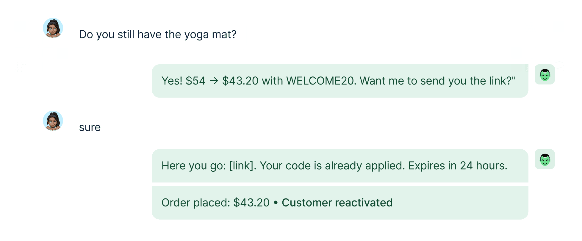 When a customer replies to a campaign, Sagepilot doesn't drop them into a queue. It continues the conversation and drives them to purchase.
