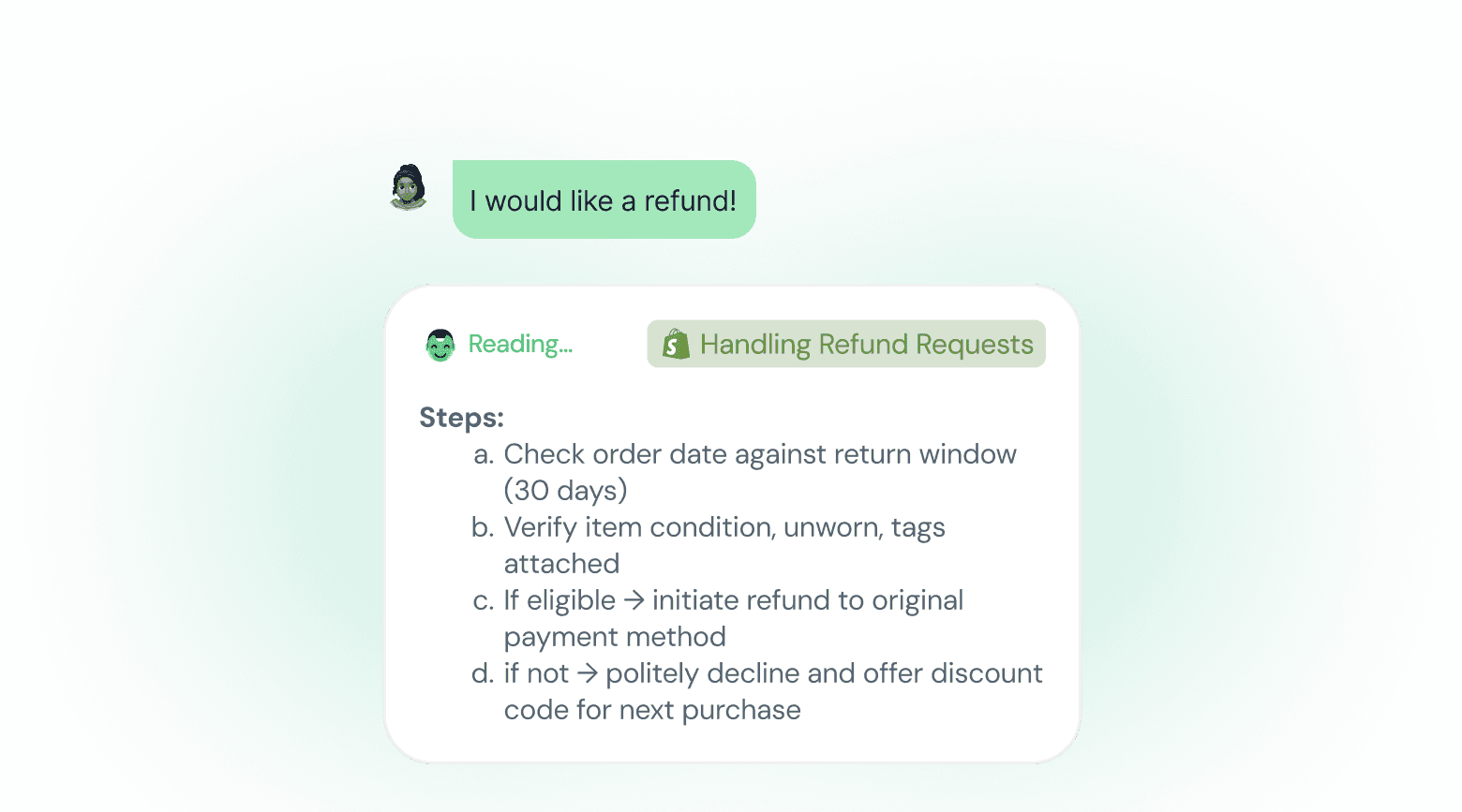 Resolves tickets using your SOPs - no deviations, no guesswork.